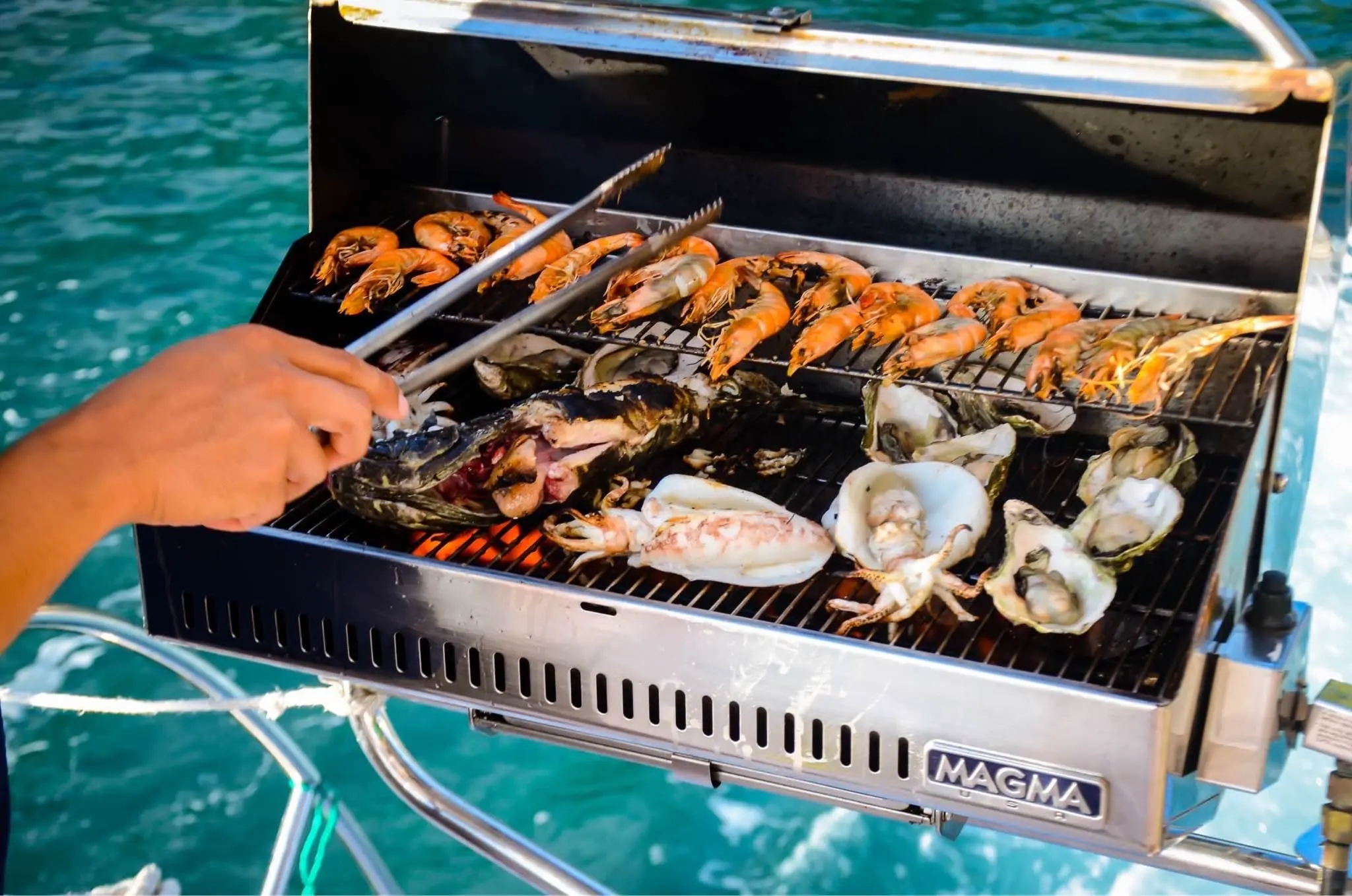 Du thuyền có hệ thống bếp và khu BBQ tiện nghi, tạo điều kiện cho du khách tận hưởng những bữa tiệc nướng thơm ngon. Dưới bầu trời xanh và cảnh biển đẹp, đây sẽ là trải nghiệm ẩm thực không thể quên.