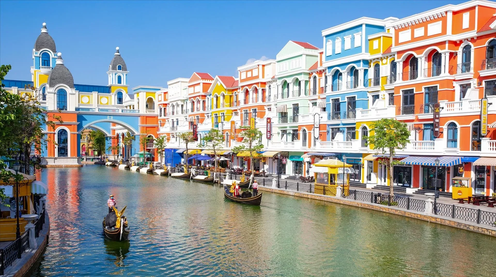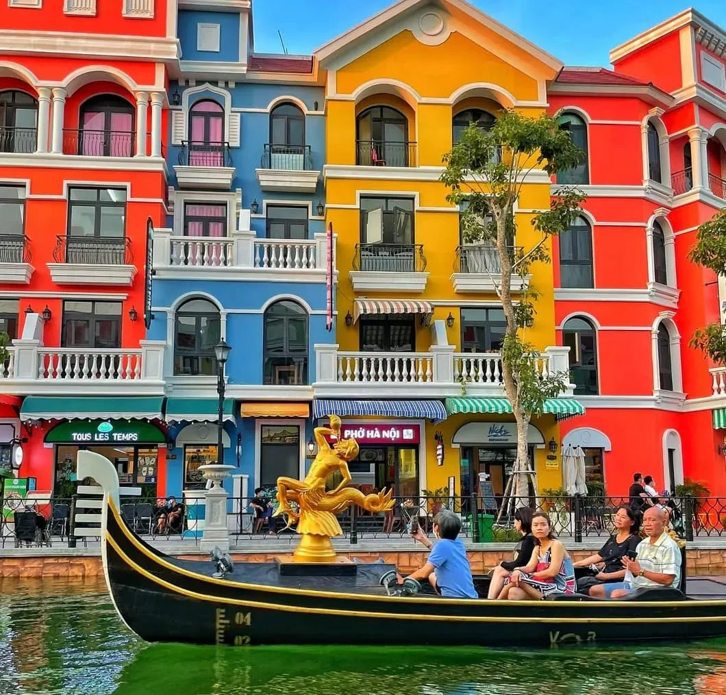 Ngay khi đặt chân đến Grand World Phú Quốc, du khách sẽ ấn tượng bởi những dãy phố rực rỡ sắc màu mô phỏng các thành phố cổ điển châu Âu. Kênh đào Venice lãng mạn, cầu cong kiểu Ý, và những chiếc thuyền gondola lướt nhẹ qua dòng nước tạo nên khung cảnh vô cùng nên thơ.