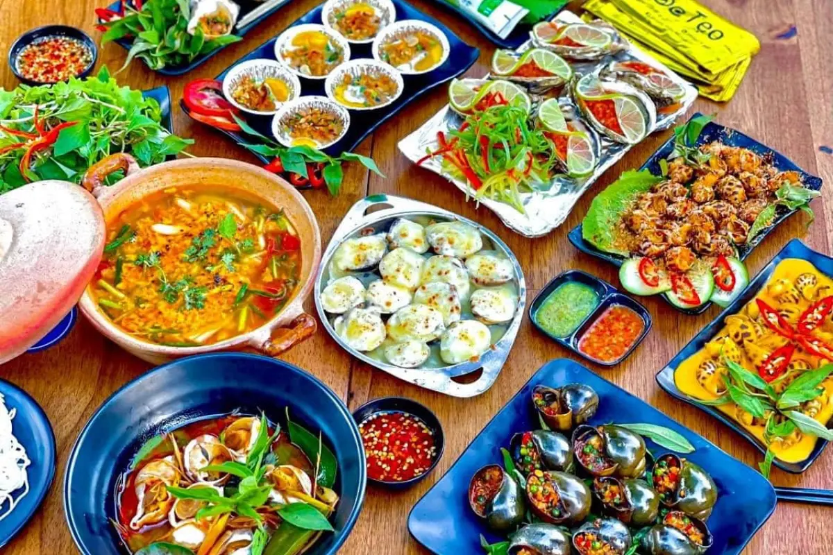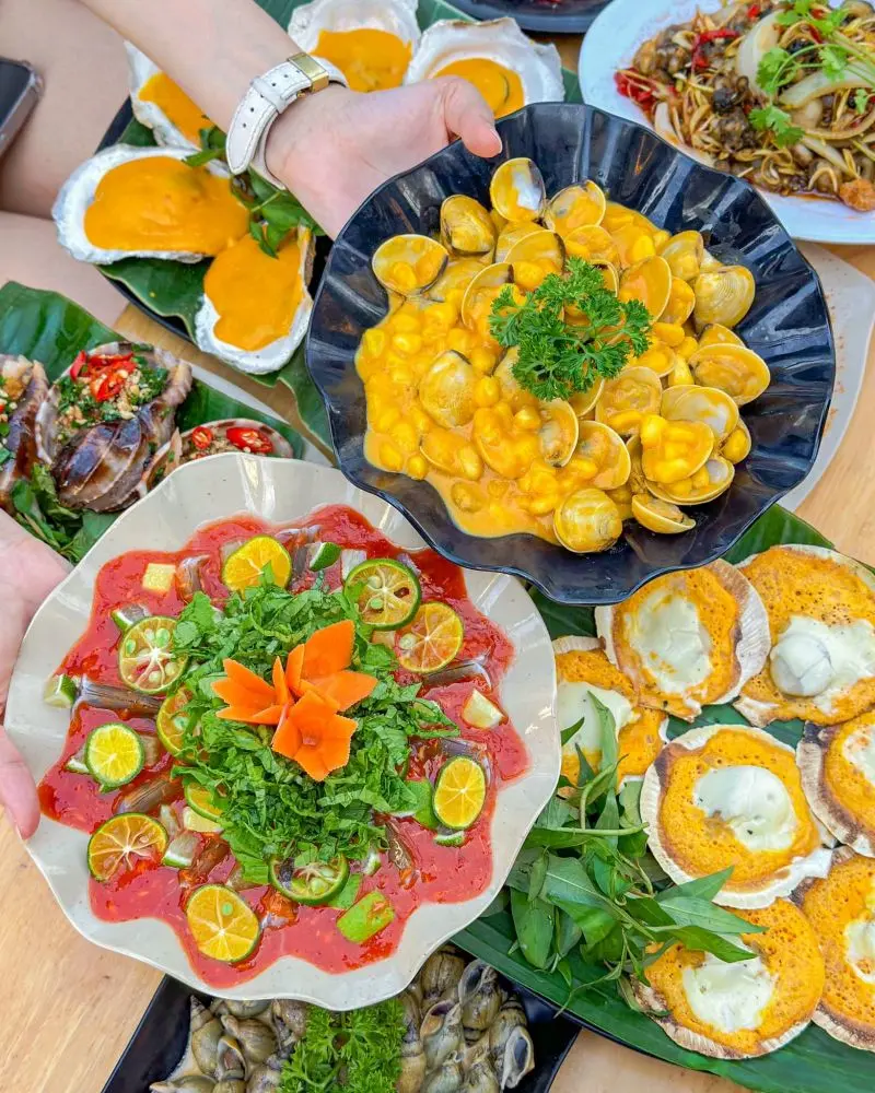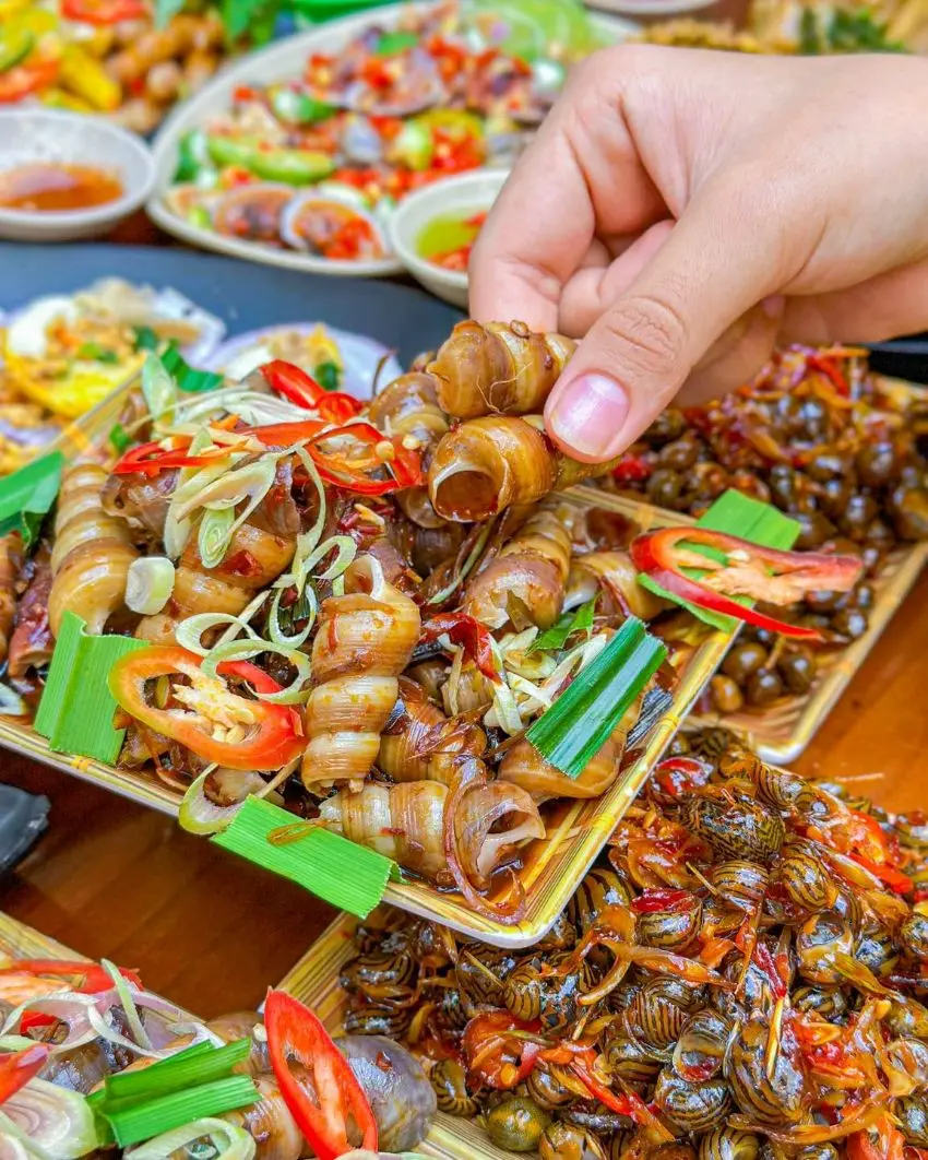 Điểm nổi bật nhất ở đây là các món ốc hút cay nồng, ốc bươu béo giòn, chế biến vừa miệng, không hề tanh. Nước chấm đậm đà, cay nhẹ nhưng thấm vị, chấm món nào cũng ngon. Ngoài ốc, quán còn có nghêu hấp sả ớt thơm lừng, hến xào ăn kèm bánh tráng hoặc bánh phồng tôm – tạo nên một bữa ăn đậm chất dân dã miền biển.