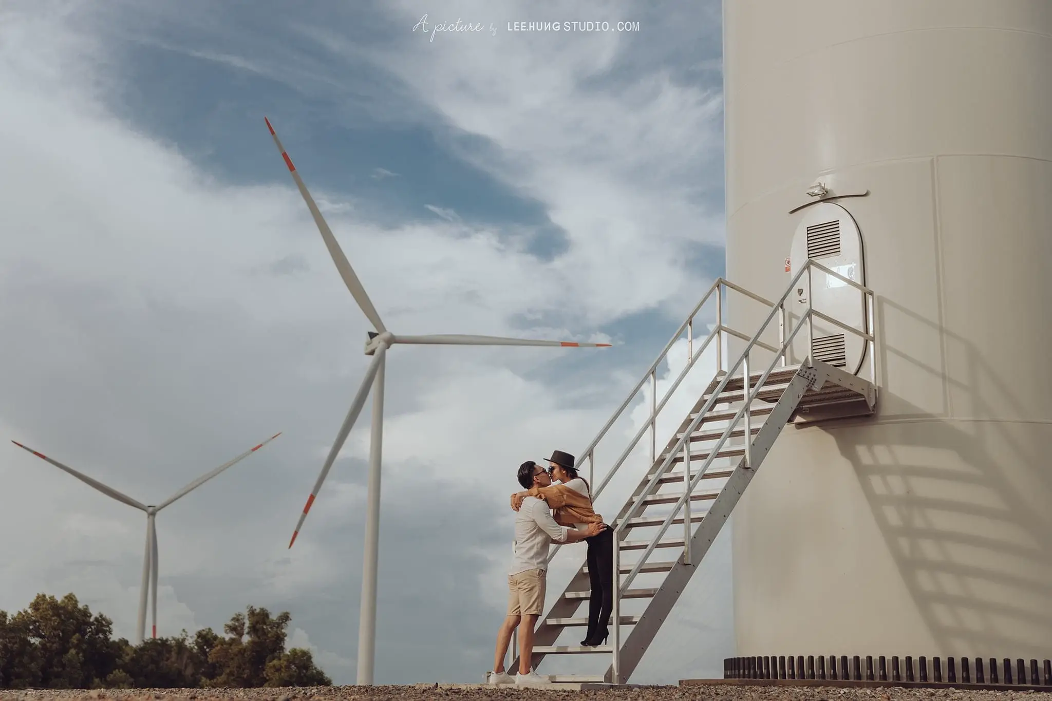- Góc từ xa với đồi cát trắng: Chụp người đứng nhỏ giữa những tuabin khổng lồ