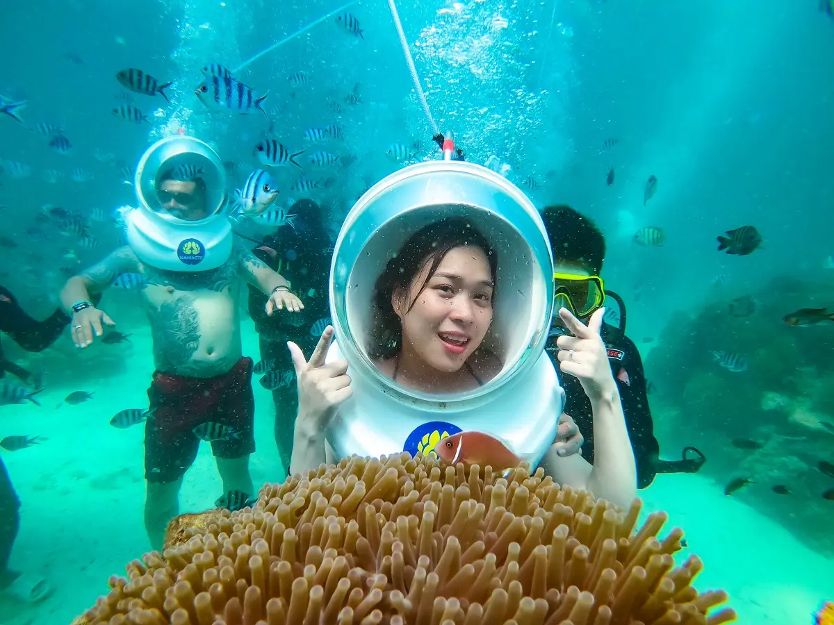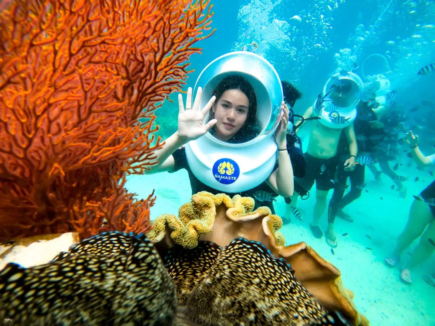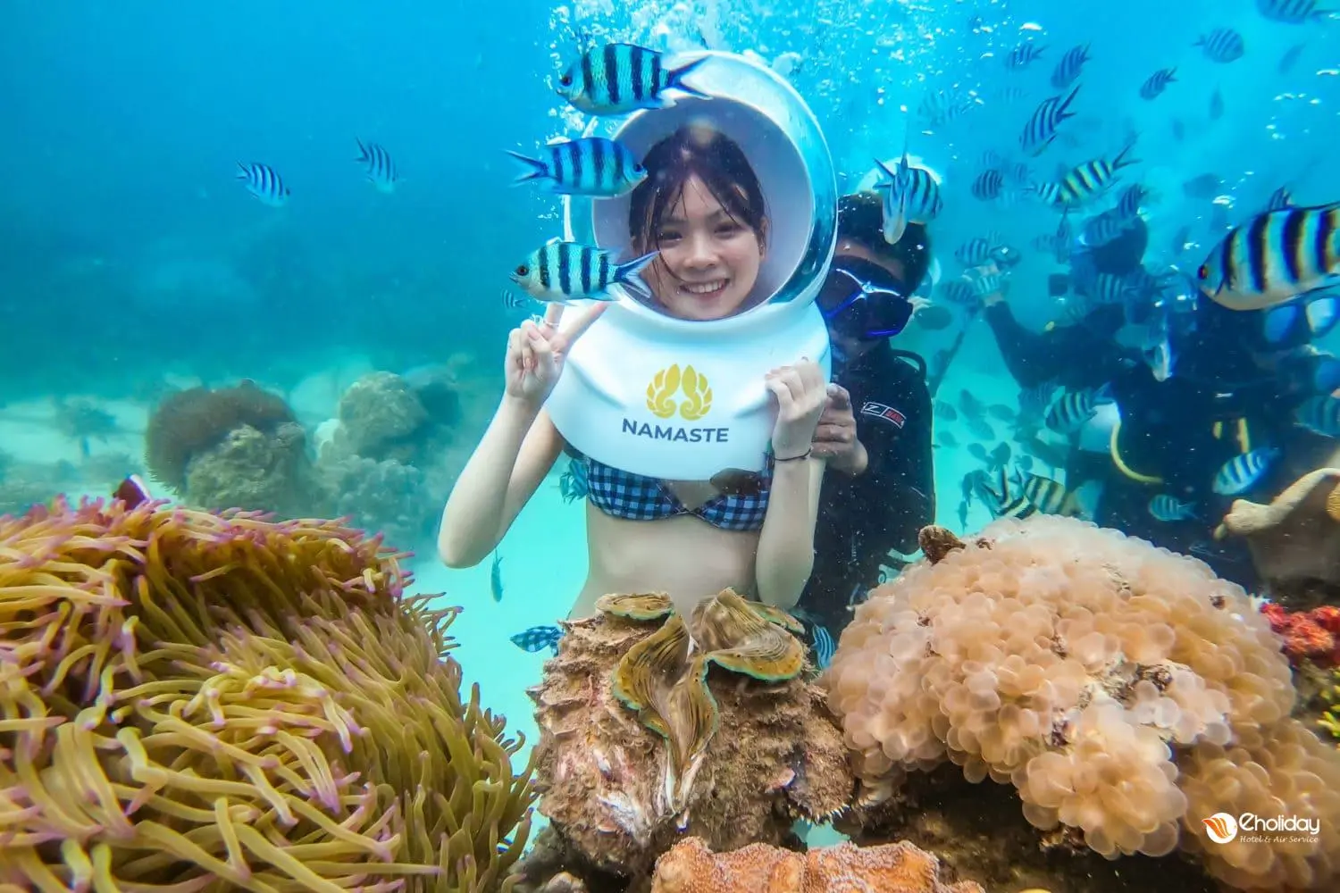 Đi bộ dưới biển (Sea Walking) là một hình thức tham quan dưới nước đang rất được yêu thích tại các thiên đường biển. Thay vì phải học lặn, bạn chỉ cần đội chiếc mũ cung cấp oxy hiện đại. Bước xuống đáy biển ở độ sâu khoảng 5–6m và bắt đầu hành trình khám phá.