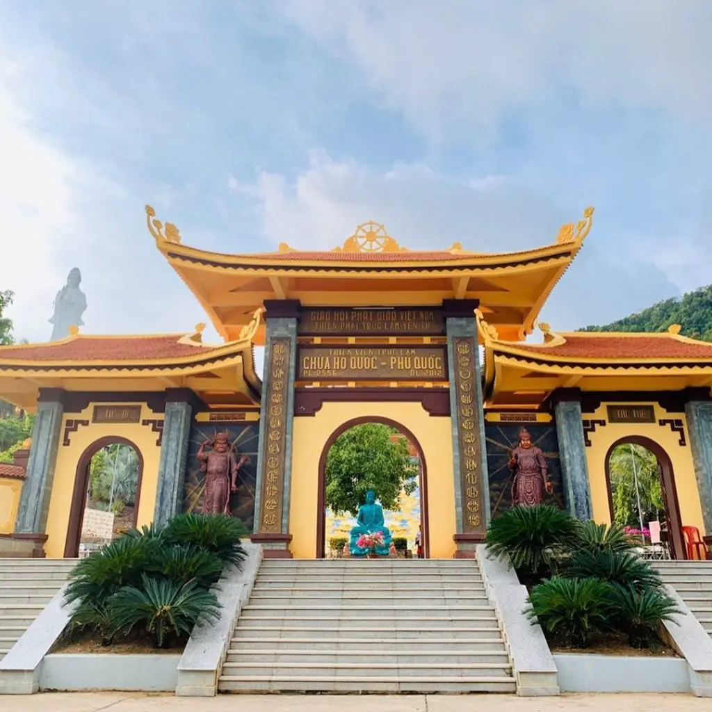 Trên hành trình tour Nam Đảo Phú Quốc, bạn đừng quên ghé Chùa Hộ Quốc. Ngôi chùa lớn nhất đảo, tọa lạc trên sườn núi nhìn thẳng ra biển. Khi bước chân qua cổng tam quan, bạn sẽ cảm nhận ngay sự tĩnh lặng, an yên lan tỏa trong từng hơi thở. Tượng Phật uy nghiêm nhìn ra biển lớn, mái chùa cong vút nổi bật giữa trời xanh. Tạo nên khung cảnh thiêng liêng mà thanh bình. Đây là nơi bạn có thể gửi gắm ước nguyện bình an cho gia đình và bạn bè.