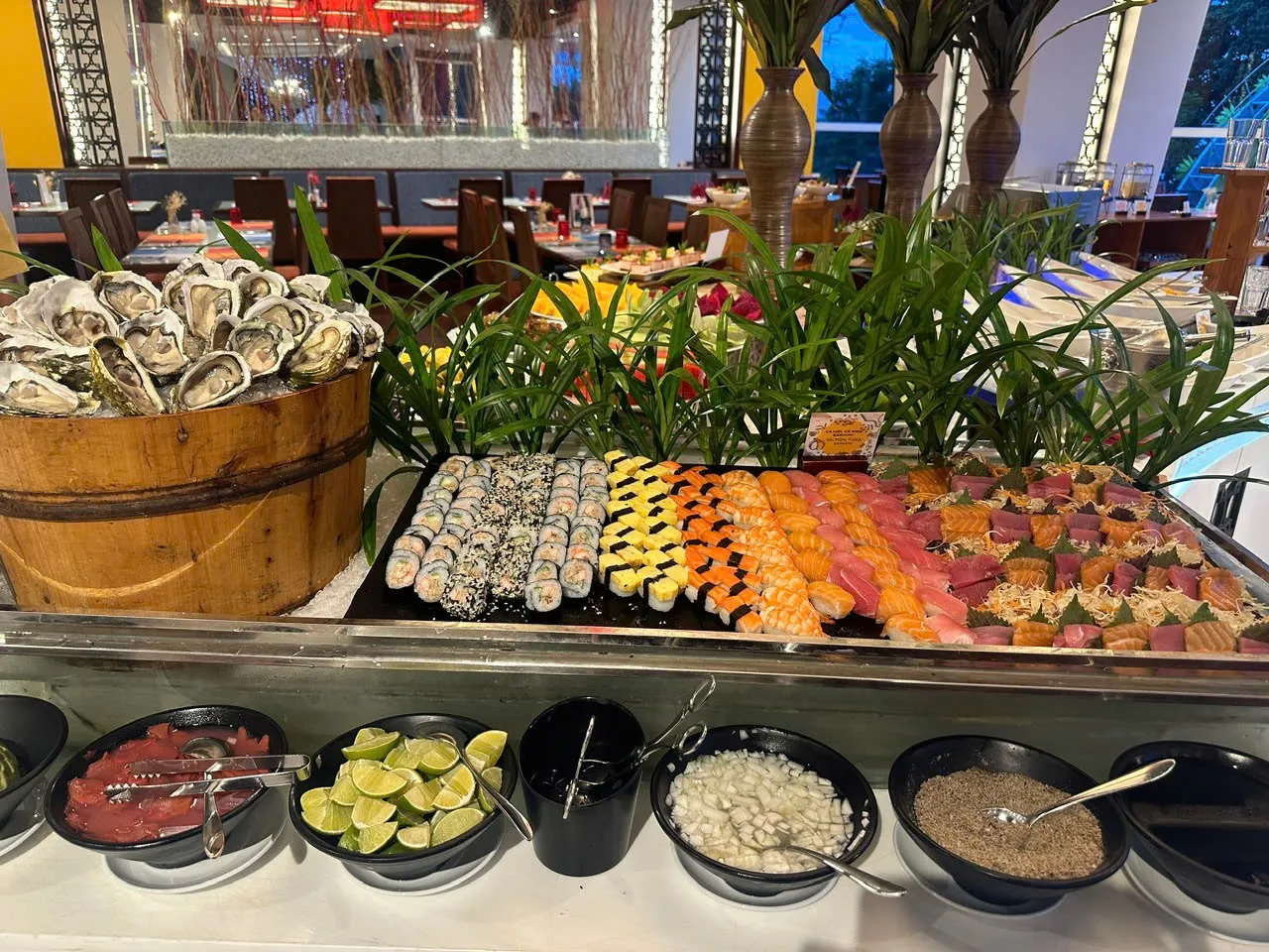 Không gian buffet được bày trí tinh tế, chia thành nhiều khu vực rõ ràng, dễ chọn lựa và mang lại cảm hứng khám phá. Trong đó nổi bật là khu hải sản tươi sống với đủ loại tôm, mực, cá, ốc… được sơ chế và chế biến ngay tại chỗ theo yêu cầu. Góc sushi và sashimi kiểu Nhật cũng là điểm nhấn hấp dẫn với nguyên liệu tươi ngon và cách trình bày bắt mắt.