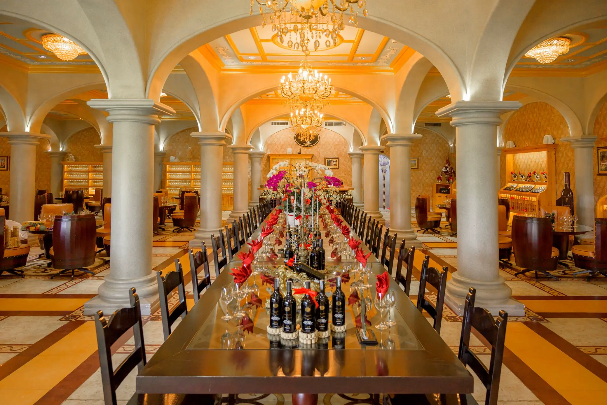 Điểm nổi bật nhất của lâu đài rượu vang Mũi Né là hầm rượu được thiết kế theo chuẩn châu Âu, nơi lưu trữ hàng ngàn chai vang cao cấp nhập khẩu từ vùng Napa Valley (Hoa Kỳ).