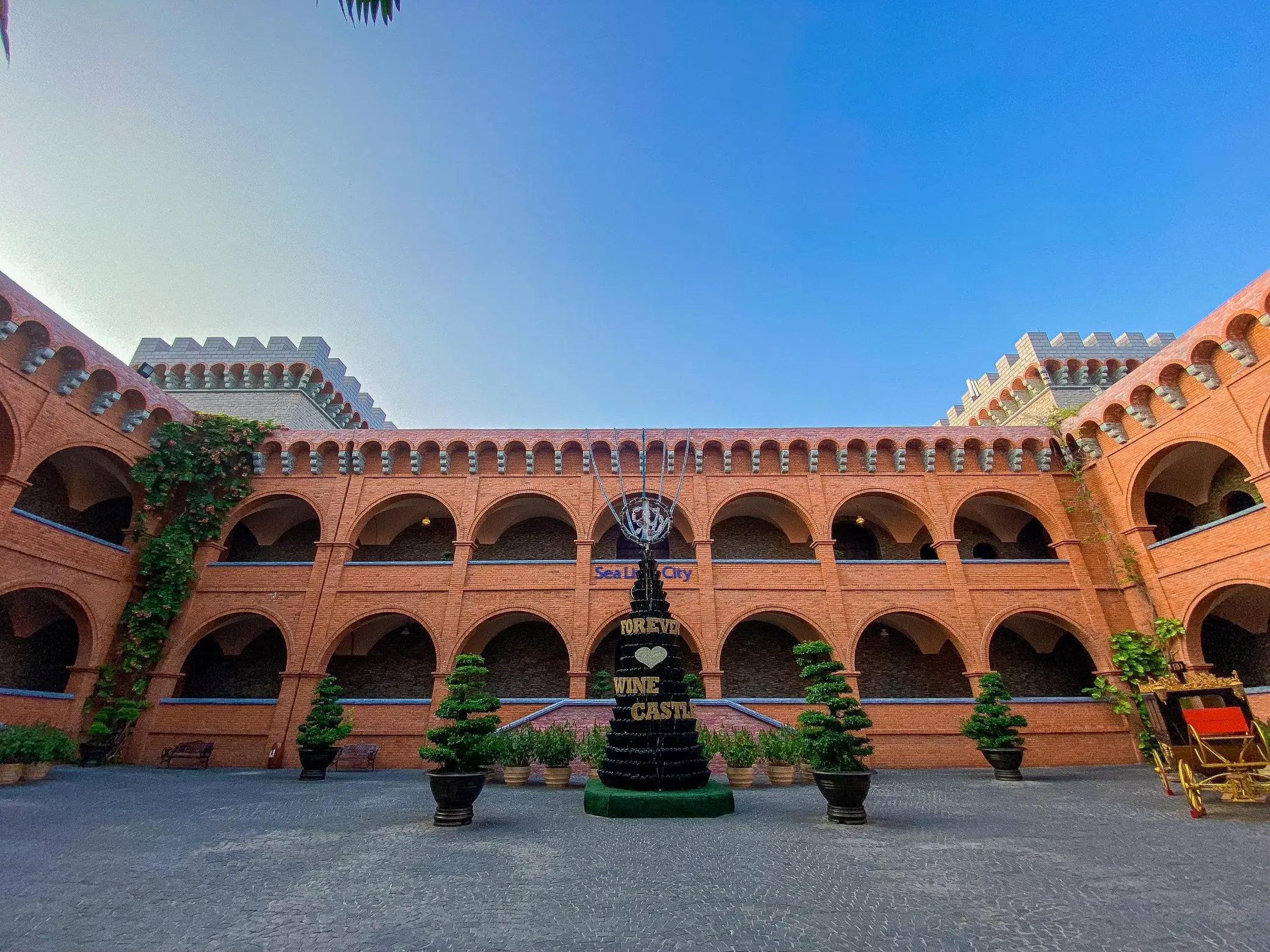 Ngay khi đặt chân đến khuôn viên lâu đài, du khách sẽ cảm nhận được không gian cổ điển với tường đá dày, tháp canh cao vút, các hành lang mái vòm và quảng trường đá rộng lớn – tất cả được tái hiện chân thực theo phong cách kiến trúc Trung cổ châu Âu.