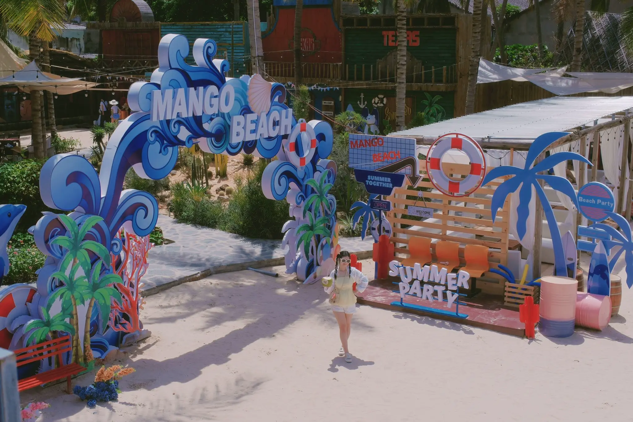 Điểm nhấn lớn nhất tại Mango Beach là thiết kế đậm chất Bohemian: từ lều trại vải trắng, cổng gỗ, chòi tre, võng lưới đến các bức tường hoa giấy và bàn ghế vintage. Mỗi góc đều được trang trí chỉn chu, rất “ăn ảnh” và phù hợp để bạn tạo nên loạt hình lung linh trên mạng xã hội.