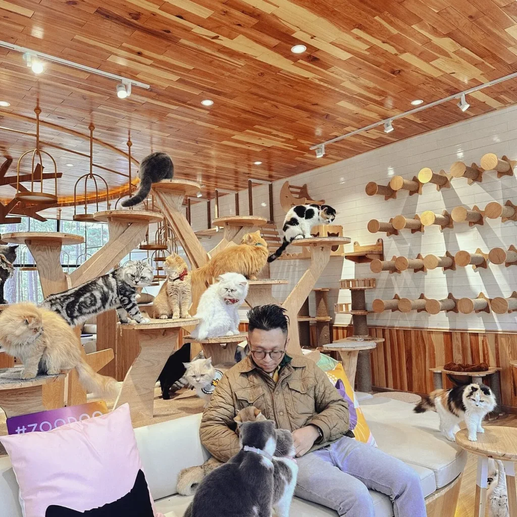 Nằm trong khuôn viên ZooDoo Đà Lạt, nơi đây không chỉ là một quán cà phê thông thường mà còn là thiên đường hội tụ hơn 50 chú mèo đủ chủng loại cùng những chú Corgi siêu đáng yêu. Luôn sẵn sàng chơi đùa và tạo nên những khoảnh khắc tan chảy con tim.